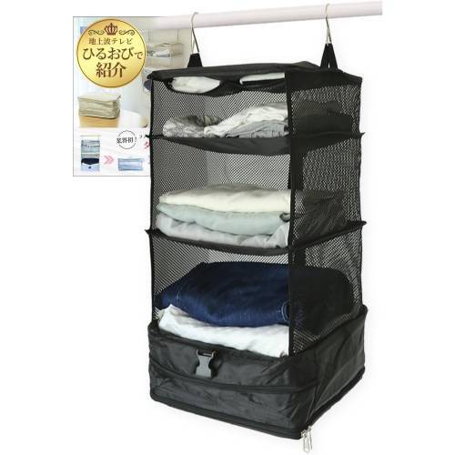 服を段ごとに入れて持ち運び、掛けるだけで収納として成立する。出して並べ直す工程を挟まず、入れた順のまま衣類の置き場になる。