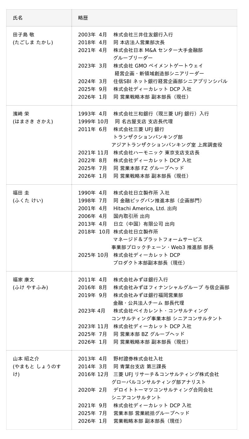 株式会社ディーカレットDCP(本社:東京都千代田区、代表取締役社長:村林 聡)は、2026年2月24日開催の取締役会を経て、2026年4月1日付での代表取締役の異動および執行役員の選任について決議いたしましたので、下記の通りお知らせいたします。