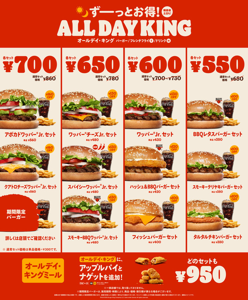 同日より、セットメニュー「オールデイ・キング」もリニューアルします。対象バーガーとフレンチフライ(S)、ドリンク(M)のセットを、550円、600円、650円、700円の4価格帯で展開し、単品とセットの通常価格より最大160円お得になるとしています。