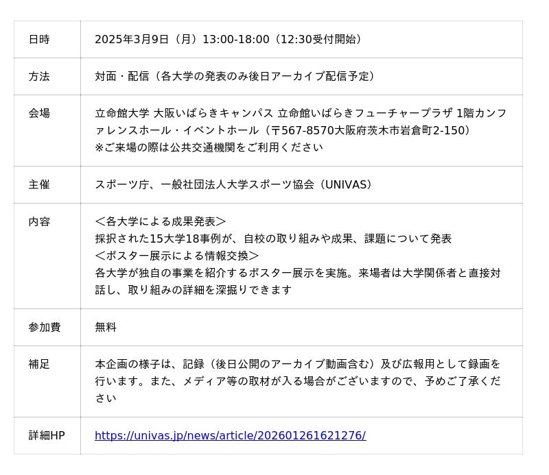 一般社団法人大学スポーツ協会(所在地:東京都千代田区、会長:福原紀彦、以下 UNIVAS)は、スポーツ庁委託事業「令和7年度 感動する大学スポーツ総合支援事業」において採択された15大学18事例による成果報告会を開催します。本イベントでは、各大学の取り組みを発表するとともに、ポスター展示を通じて情報交換を促進し、「大学スポーツ×地域」の未来について考える機会を創出します。