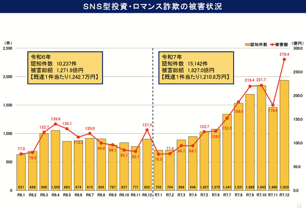 数年前から問題になっているSNS型投資/ロマンス詐欺も規模を拡大させています。2025年の認知件数は1万5142件、被害額は1827億円で過去最多。前述の特殊詐欺をしのぐ金額となっています。
