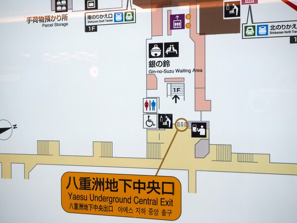 「銀の鈴」があるのは、東京駅の地下1階。まずは電車のホームから地下1階を目指します。地下中央通路に並ぶお弁当屋さんやスイーツショップを横目に見ながら、八重洲地下中央口に向かって進むと…、鈴のオブジェが見えてきました。あら、もっと迷うかと思っていましたが、意外とあっさりたどり着けましたよ。