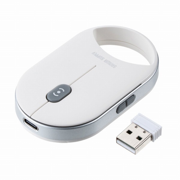 重さわずか30gの超薄型(1.3cm)小型ワイヤレスマウス。Bluetooth×2台、USB-Aレシーバー×1台と接続でき、USB充電式なので乾電池は不要。カラビナなどをつけて気軽に持ち運べるのが実に便利。スクロールやホイールクリック、進む/戻るボタン、カウント切り替えもこのサイズながら実現!