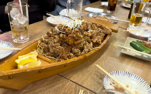 さあ、冒頭の写真を見てください。舟盛りですね。唐揚げで舟盛りってあまり聞いたことがありませんけど、ちばチャンで「大バカ盛り」の唐揚げを頼むと、舟盛りで運ばれてくるんです。