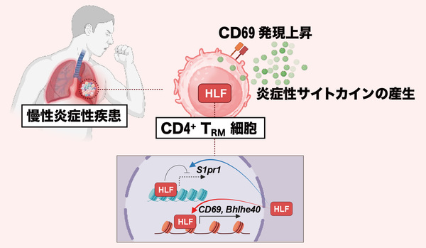 千葉大学大学院医学研究院の平原潔教授らの研究グループは、免疫細胞の一種である「組織常在性記憶CD4⁺T細胞(CD4+TRM細胞)」が、病原性微生物による感染後の肺や腸などの組織に長期間とどまるメカニズムを解明。炎症を引き起こす分泌たんぱく質である炎症性サイトカインの持続的な生成が、遺伝子の働きを調節するたんぱく質のHLFによって制御されていることを特定しました。また、研究グループは、HLFが欠損したマウスではCD4+TRM細胞の数が著しく減少し、炎症および線維化による組織の硬化が抑制されることを発見。HLFが同細胞の組織への定着に関わる因子と、組織からの移動に関わる因子を直接制御して、組織に長くとどまらせていることを見いだしました。さらに、ヒトのさまざまな慢性炎症性疾患において、HLFに反応する同細胞が病変組織に入り込んでいることを確認しました。