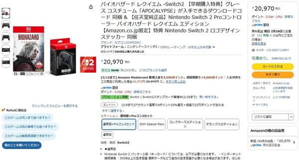 Amazon.co.jpにて、「バイオハザード レクイエム+Nintendo Switch 2 Proコントローラー バイオハザード レクイエム エディション【Amazon.co.jp限定】」のセットが販売中だ。価格は2万970円。