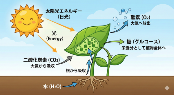 プロンプト:光合成の仕組みをシンプルな図解で描いてください。太陽・水・二酸化炭素・酸素・糖の5要素を矢印でつないで、それぞれにラベルを付けてください。