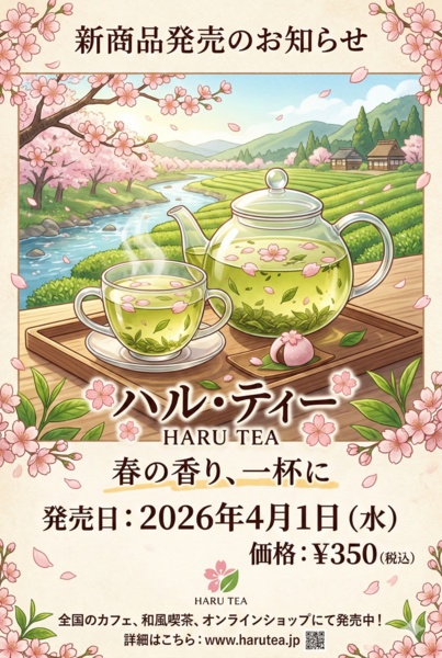 プロンプト:「新商品発売のお知らせ」というタイトルのポスターを作ってください。商品名「HARU TEA」、キャッチコピー「春の香り、一杯に」、発売日「2026年4月1日」、価格「¥350」をすべて正確に読めるテキストで配置してください。