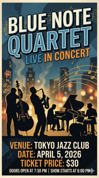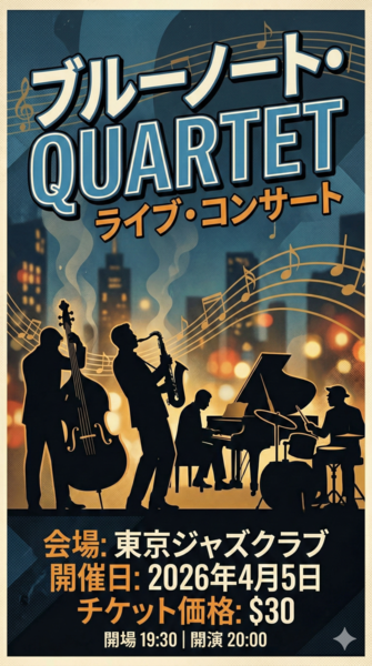 レイアウトと配色はほぼ維持されたまま、「VENUE→会場」「DATE→開催日」といった自然な日本語への置き換えと、「7:30PM→19:30」のような表記変換も実行された。一方、「BLUE NOTE QUARTET」が「ブルーノート・QUARTET」と半訳になった点や、「$30」が円換算されなかった点は、ローカライズとしては不完全だ。完成物として使うには確認と修正が前提になる。