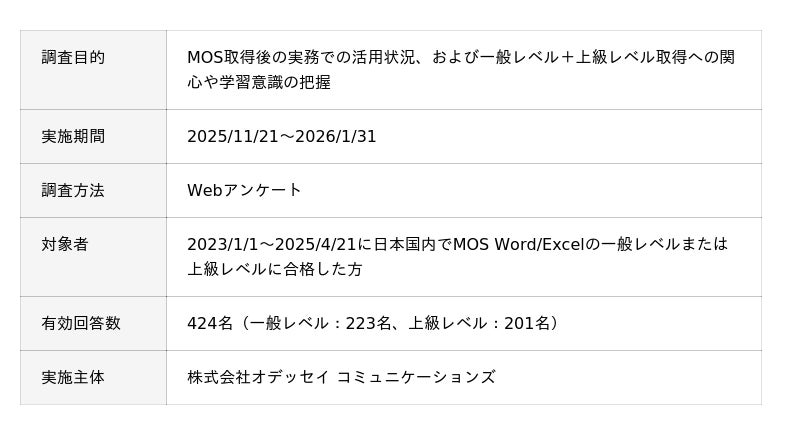 CBT(Computer Based Testing)のリーディング企業として、マイクロソフト オフィス スペシャリスト(MOS)やビジネス統計スペシャリストなどを実施・運営する株式会社オデッセイ コミュニケーションズ(東京都千代田区 代表取締役社長:出張勝也)は、MOS一般レベル・上級レベルそれぞれの合格者を対象にアンケートを実施し、本日結果を公開しました。