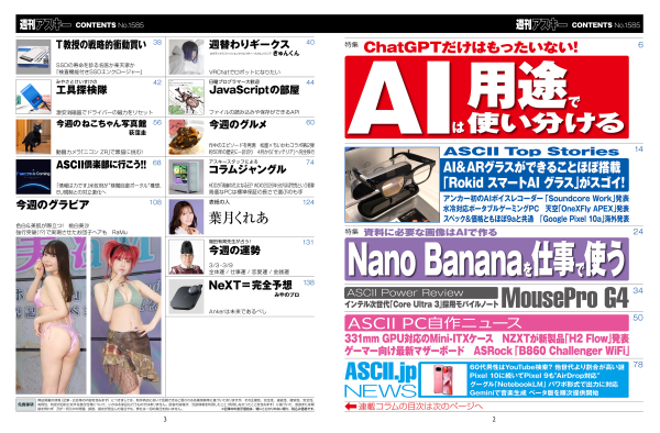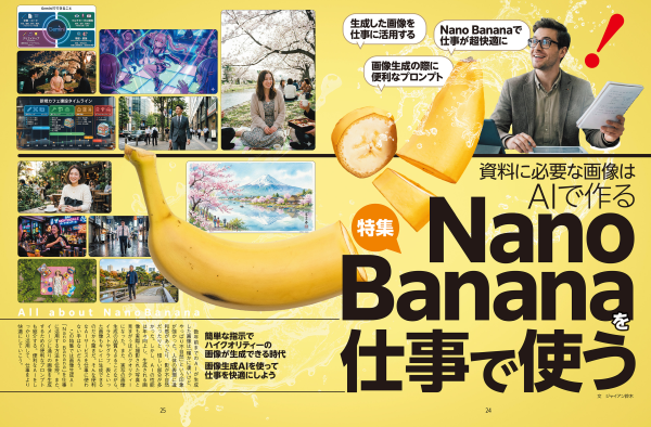 特集1ではさまざまなAIサービスをどのように使い分けるか。用途別に主要AIサービスを比較。ランキング化した。活用して生産性を高めよう。特集2ではNano Bananaの活用法。仕事や資料作りにも役立てよう!