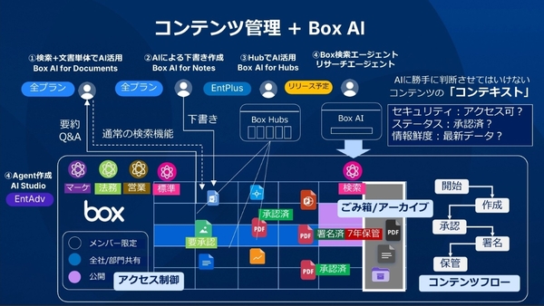 2つ目は「ステータス」だ。Box Relayでは上長の承認状況、Box Signでは署名の有無といったファイルのステータスを、メタデータとして付与できる。最後は「情報鮮度」だ。古くなったコンテンツはゴミ箱やアーカイブに移すことで、Box AIが参照するコンテンツを最新のものに保てる。「しっかりとコンテンツを管理した上で、AI活用しましょうというのがBoxのメッセージ」(浅見氏)