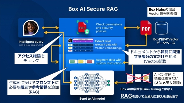 ハルシネーションに対しては、「Secure RAG」という仕組みを用意している。まず、LLMに答えを求める前に、対象のドキュメントのアクセス権限をチェックする。問題なければ、ドキュメントから質問に関連する情報だけを抽出。そして、LLMに投げるプロンプトに必要となる指示や情報を追加するといった仕組みだ。「Box AIは、学習やファインチューニングした情報ではなく、あくまでBox内の一次データを基に回答するため『勝手に物語を作ったりはしない』」(浅見氏)