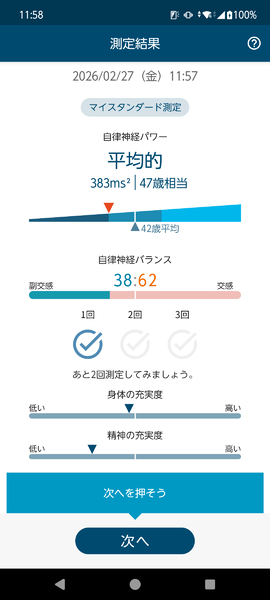 すべての人が使う機能とは言いがたいが、ヘルスケア関連機能として背面カメラ下のセンサーから読み取ったバイタルデータから、自律神経の活性度を算出する機能もある。さらに歩数計アプリも装備している。