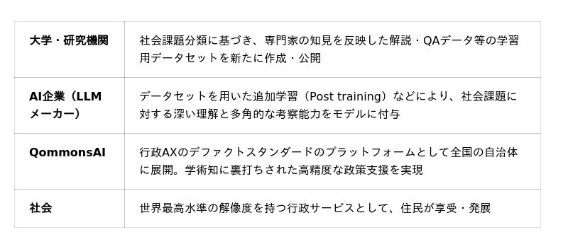 このプロジェクトは途方もなく困難な挑戦です。億単位の論文を社会課題に沿った新しい座標軸で再構造化し、自治体の業務で使えるレベルまで精度を高めること。学術界、AI産業界、行政の三者の協働によってのみ可能となる事業です。そしてこのプロジェクトが日本から始まることには必然性があります。世界に先駆けて超高齢化・人口減少・地方消滅・財政制約に直面する「課題先進国」としての切迫性が、学術知を実用的な社会課題分類へ転換する動機を生んでいます。そしてQommonsAIという約700自治体への社会実装チャネルが既に存在している。課題の深刻さ、学術知の蓄積、AIプラットフォームの実装基盤--この三つが同時に揃う場所は、日本以外にほぼ存在しません。