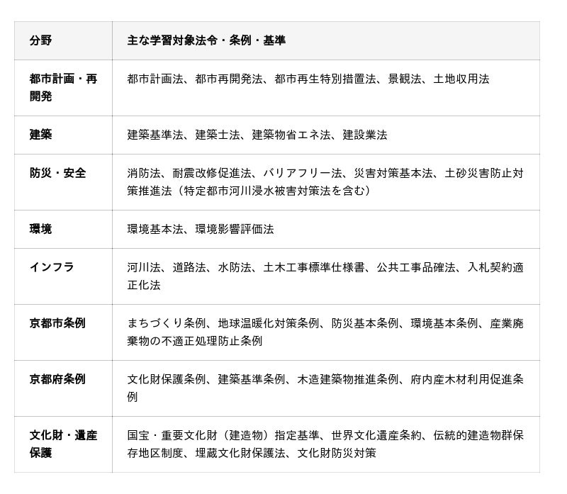 「洛索」は、以下に示す広範な法令・条例・基準を学習文献として束ねています。