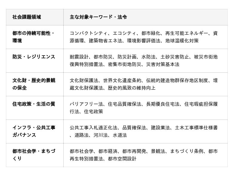 「洛索」は、「都市計画・建築・建設」という単一の学問分野ではなく、そこに関わるすべての社会課題を横断的にカバーします。当社が定義した社会課題分類に基づき、以下の6つの領域を統合しています。