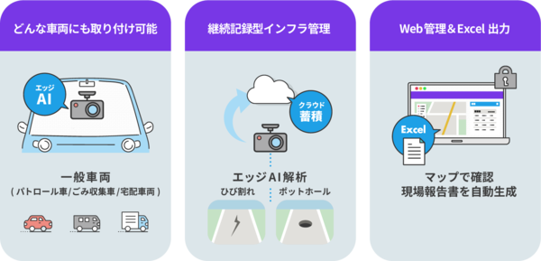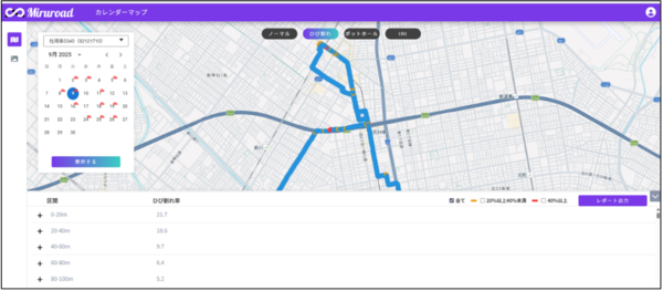 「Miruroad」は、車両に同社独自のAIファームウェアを搭載した通信型ドライブレコーダー(エッジAI端末)を取り付け走行することで、エッジAIが路面の異常を検知・記録しクラウドアプリケーションで点検や帳票出力する。地域を巡回するパトロール車やごみ収集車、宅配車両などに取り付けるのみで、走行映像から「ひび割れ率」「ポットホール」を自動で解析するという。従来の目視点検に頼らない道路メンテナンスの実現を支援する。