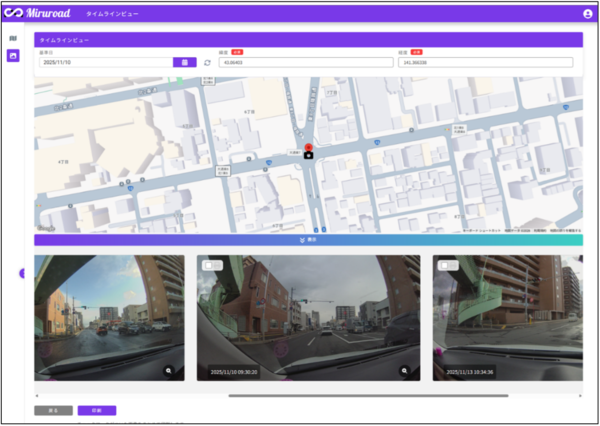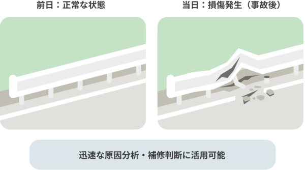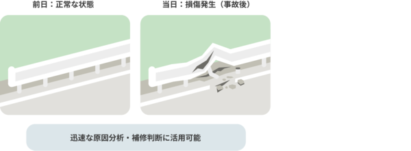 加えて、同一地点の状況を時系列で確認できるため、「いつ、どのように路面が悪化したか」を可視化できるとのこと。事故時には直前の正常な状態を即座に示せるため、迅速な原因分析や補修判断に加え、損害賠償の裏付け資料としても有効だとしている。