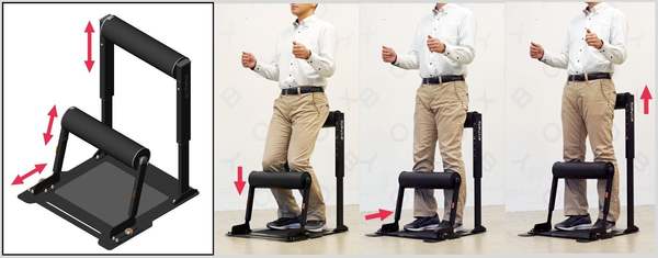 製品の特長は、足元に置くだけの手軽さ、スネとモモで身体を支える安定感、高さ・位置の調整でさまざまな体型や姿勢、作業シーンに柔軟に対応する多用途さといった点が挙げられている。また、スネ用・モモ用のクッションの高さと前後位置を個別に調整でき、使用者の身長や体型、立ち姿勢(まっすぐ/軽い前傾など)、作業シーンなどに応じて設定可能。姿勢のふらつきを抑えながら安定した立ち姿勢をサポートするという。