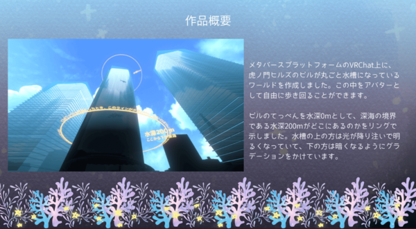 土日に科学館のボランティア活動を行っているうっぴー氏。そこでの活動がワールド制作のきっかけになった。「虎ノ門深海水族館」はVRChat上に作成した虎ノ門ヒルズのビルを丸ごと水槽にしたワールド。アバターとして自由に歩き回ることができる。深海のスケール感を実在のビルを使うことでリアルに体感できるというコンセプトだ。