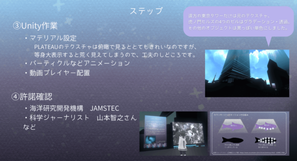 ビルを水槽にするというコンセプトを表現するために、虎ノ門ヒルズの4つのビルは透け感のあるグラデーションのマテリアルに設定し、他の建物や道路標識を黒系の単色にし、世界観を統一した。ただし、東京タワーだけはそのまま残した。また、ワールドに展示している画像や動画の転載については、権利者のJAMSTECなどに許諾を得た。この許諾確認は、自分にとって勇気が必要な行動だったと振り返った。