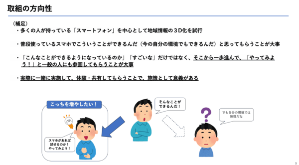 今後の方向性として、モバイル3Dスキャンの取り組みを継続しつつ、PLATEAUとモバイル3Dスキャンを連携させて活用し、学生が地域とつながり、地域をより楽しく学ぶきっかけにしていきたいと述べた。