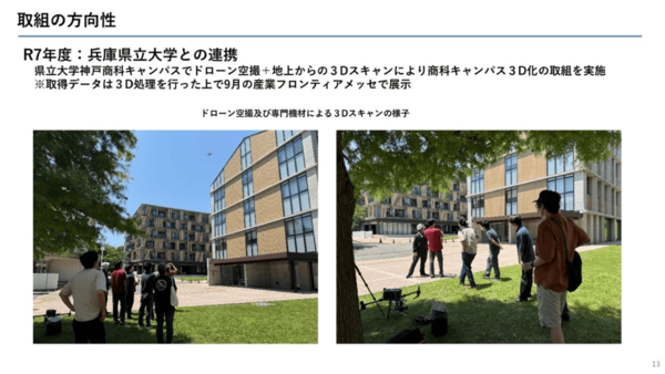 「普段使っているスマホでこういうことができる」という気づきから、体験の共有につなげたいという。具体的な事例として、昨年度は兵庫県立大学(協力:社会情報科学部大野暢亮教授)の学生による地元の国宝建造物の3Dスキャンや、県職員による県公館のデジタル化を試行。今年度は、兵庫県立大学などと連携して、3Dスキャンのワークショップを行ったり、ドローン空撮+地上からの3Dスキャンによりキャンパスの3D化に取り組むなどしているという。