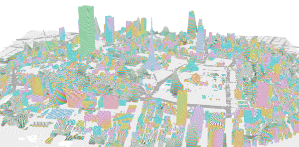 東京タワー周辺の建物データを読み込み、変形、色を変えるなどの表現を行った初期作品に対し、今回、建物が現れるアニメーションや、クリック操作によってグリッド状/ボクセル状に形を変えるギミックを実装するなどブラッシュアップを施した。パラメーターがマウスホールドや時間経過により変化し、様々な動きと表情を見せる作品に仕上がっている。