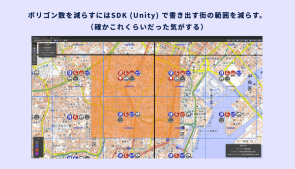 ・PLATEAUSDKforUnityで書き出す街の範囲を制限。さらに、ドローコール(描画命令)の回数を削減することで負荷を軽減