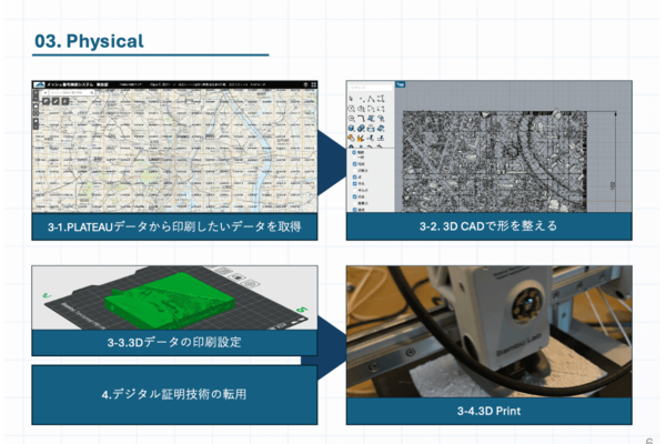 「フィジタル(Phygital)」は、PLATEAUの建築データと地形データから成るモデルを3Dプリントで生成し、立体の参加証として持ち帰ることができるシステム。3Dプリントの成果物の側面に証明書となるブロックチェーンによるデジタル署名(NFT:Non-FungibleToken)を刻印することで、唯一無二の参加体験であることが明示できる。