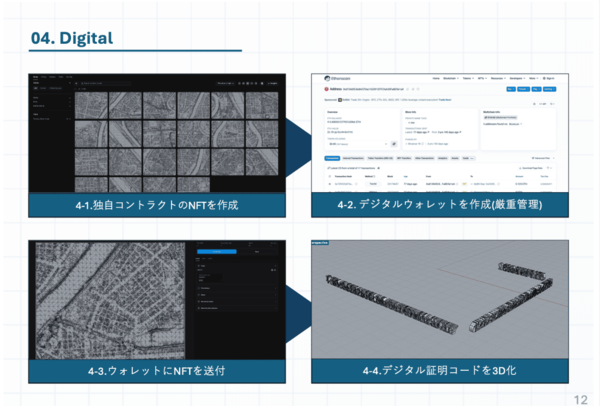 まず、該当のPLATEAUのデータをライノセラス(Rhinoceros)やBlender等でデータ編集し、3Dプリント用のモデルを準備する。別途作成したNFTをウォレットへ送付し、ウォレットから得たデジタル証明書(秘密鍵等の証明コード)をQRコードにして3Dモデルの側面へ刻印する。