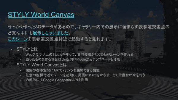 技術的には、現実の特定箇所にARコンテンツを展開できるSTYLYの機能「STYLYWorldCanvas」とPLATEAU、そしてGoogleGeospatialAPIを組み合わせている。設定された座標付近でアプリを起動し、カメラで周囲をかざすことで正確な位置合わせを行い、現実の建物などにモデルをぴったりと表示させることができる。