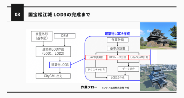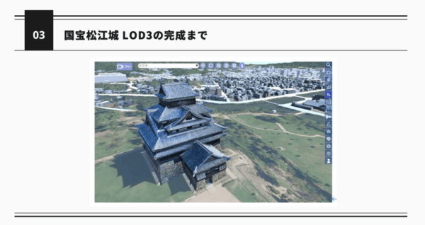 松江市は、国宝・松江城を全国でも珍しい高精度なLOD3.3で整備している。島根県松江市まちづくり部都市政策課のnarai氏はその計測プロセスと活用計画を紹介した。