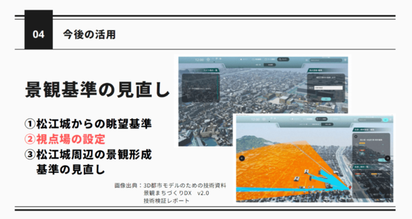 今後、整備した高精度の松江城LOD3.3モデルを景観事前協議などへ活用することを目指すという。というのも、松江城近隣に高層マンション建設計画があり、それを含め「松江城の何が見えるか」を細かく設定するよう景観基準の見直しが検討されている。松江城の周囲に「視点場」を設定し、新規建設の事前協議の際、3D都市モデル上で新築建物がその視点場からの景観基準(松江城の何が見えるか)を満たしているかどうか、窓口で業者と確認できるようにするということになる。LOD3.3の精巧さを生かした景観シミュレーションにより、業務の効率化を図ることができるとする。