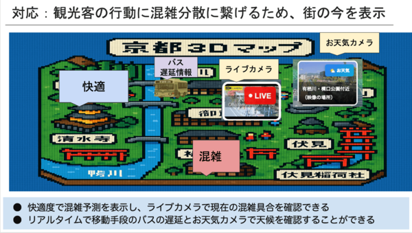 「LIVING CITY MIRROR」は、観光客の混雑分散を目指し、「現在の町の今を表示する」ことで観光客の流れを最適化することを目的としたシステムだ。