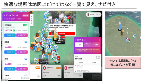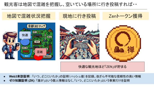 時間帯ごとの混雑状況の予測を表示するほか、YouTubeライブカメラなどを地図上に表示し、現在の状況(人出、天気、トイレ、バス情報等)を確認できる。また、空いている観光地を優先的に巡った観光客に対し、(「徳を積む」というコンセプトで)「Zenトークン」をプレゼントするインセンティブシステムを取り入れた。空いている場所を巡ることでレベルが上がり、「わびさびマスター」になるというアイデアも構想していたが、これは実装が間に合わなかった。