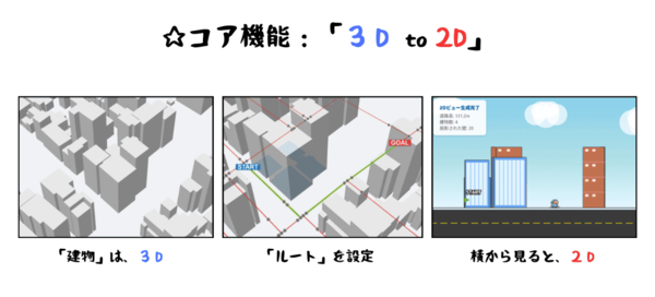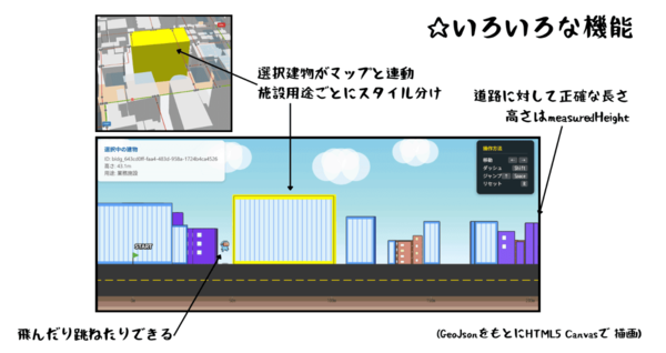 制作の出発点は、PLATEAUのユースケース成果物である「3D都市モデルを利用したネットワーク生成ツール」にあった。このツールが道路データをノード(点)とルート(線)に分解してくれる点が非常に有用だと感じたのである。また、街を歩く際、人が最も見たりアクセスしたりするのは建物のファサード(正面部分)であるという点に特化することで新しい面白さが生まれると考えた。もちろん、2D横スクロールゲームへの愛(「マリオ大好き」という個人的な動機)もあったという。