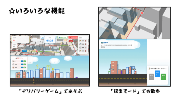 2Dビューの建物と地図上の3D建物は連動し、建物の用途属性に基づいたスタイルが、2Dの建物デザインに反映されている。また、2Dビュー側でクリックした建物が3D地図上でも表示される。探索モードの他、ピザや新聞を配達して遊ぶゲームモードもある。