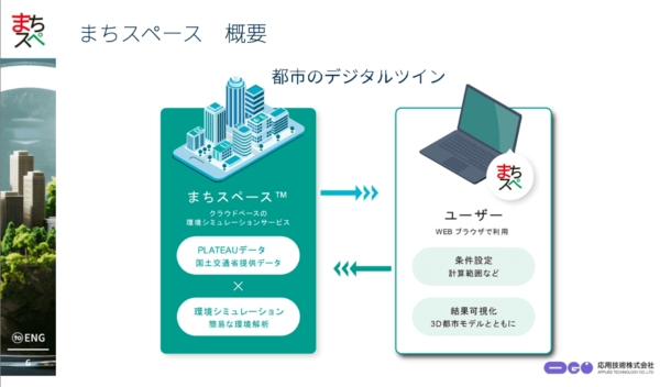 「まちスペース」は、PLATEAUによる正確な3Dの建築物データとWebGL(Cesium等)技術の発展を組み合わせることで、クラウドベースで行った環境シミュレーション結果をPLATEAUのデータの中で3Dで可視化することを目指す。