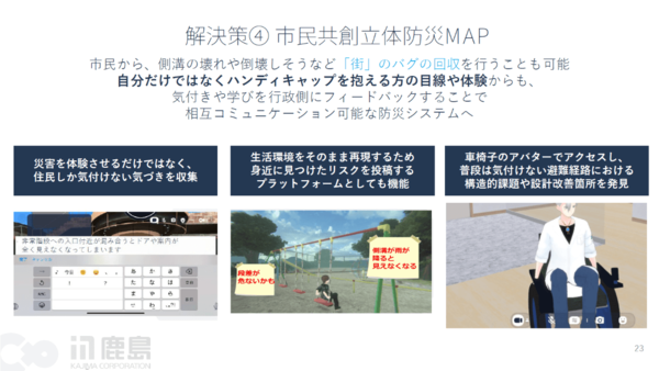 こうした課題に対し、PLATEAUやメタバースを活用したデジタルツイン上で、災害時の状況を事前に体験・学習できる環境を構築する。誰でもアクセスできる3Dのバーチャル都市を用意し、立体的かつ直感的にリスクを理解しながら、住民と行政が双方向で情報を共有・議論できる場を目指す。なお、本提案は「仙台BOSAI-TECH」のプログラムに採択され、仙台市内で実証を検討している。
