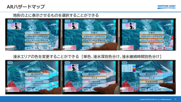 そこで同社が提案したのが、AR技術を用いてハザードマップを立体的に表示する「ARハザードマップ」。平面の防災マップにスマートフォンやタブレットをかざすことで、地形や浸水状況を3Dで可視化し、難解になりがちな防災情報を直感的に理解できるようにするもの。
