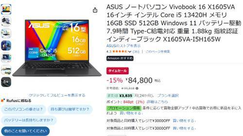 ASUSの16型ノートPC「Vivobook 16 X1605VA」がAmazonでタイムセール対象。参考価格99,818円のところ、15%オフの84,800円で販売中。
