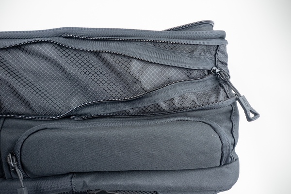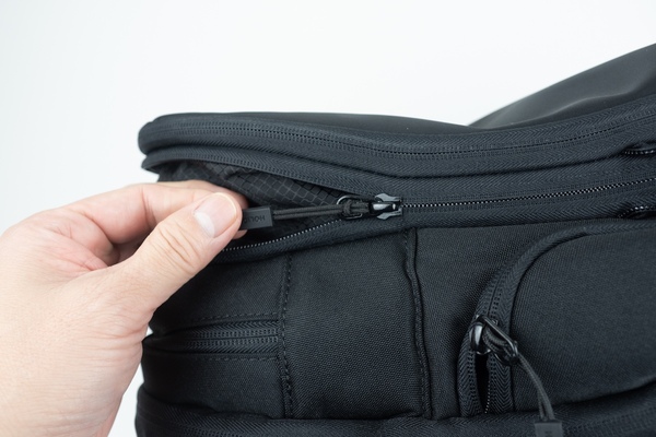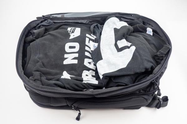 しかし、「One mini」ならその心配は無用。旅行グッズなどでおなじみの“ファスナーでギュッと圧縮できる衣類バッグ”と同様の構造を、バッグ本体に内蔵しています。最大でTシャツ約12枚分を収納でき、ファスナーを締めるだけでカサを半分ほどに圧縮できる強力な「洋服圧縮スペース」を備えているのです。