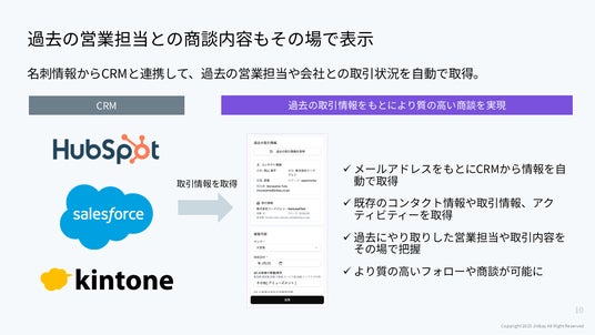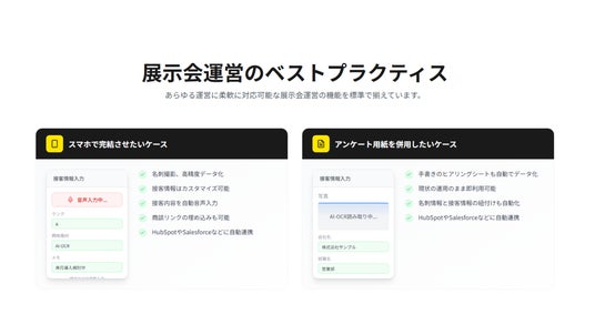 名刺情報、ヒアリング内容、展示会属性データを一体で管理し、SalesforceやHubSpotなど主要CRMとの連携にも対応しています。