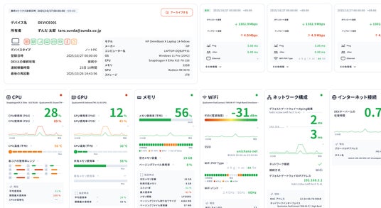 デバイスのCPU負荷、メモリ使用率、バッテリー状態、Wi-Fi強度などを可視化。「PCのスペック不足」なのか「ネットワーク遅延」なのか、遅さの原因を明確に切り分け可能です。