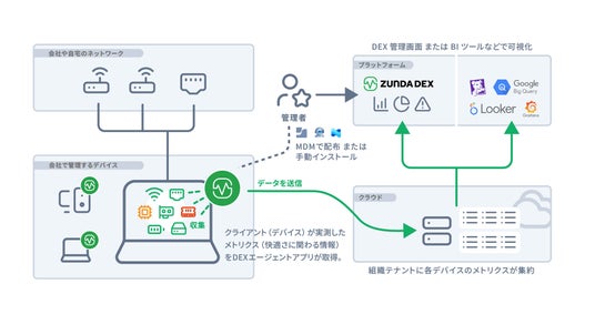 そこで同社は、PC・ネットワーク・会議品質・利用状況など、働く環境を構成する要素を横断的に可視化し、体験のボトルネックを特定できるプラットフォームとして「ZUNDA DEX」を開発しました。