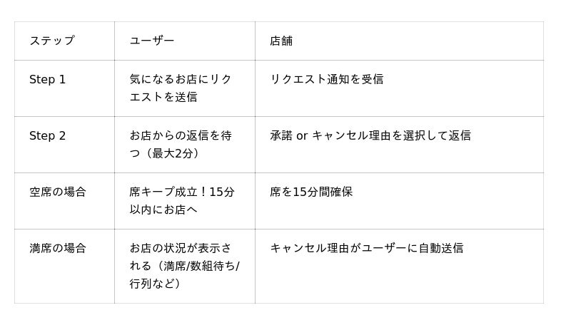 imakoの「直前席キープ」を導入することで、ユーザーは行く前にお店の“今”を確認でき、満席でわざわざ足を運ぶことを防げます。空いていればそのまま席をキープできるため、お客様に安心してお店に向かっていただくことができます。