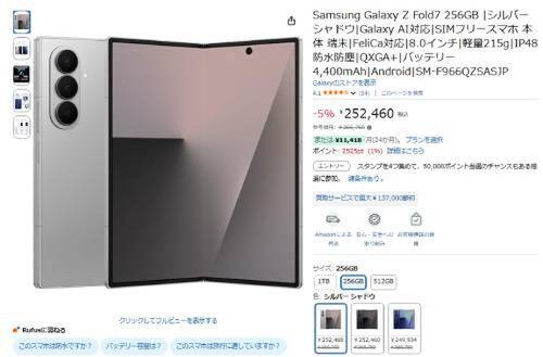 Samsungの折りたたみスマートフォン「Galaxy Z Fold7(256GB)」がAmazonで割引対象。参考価格265,750円のところ、5%オフの252,460円で販売中。