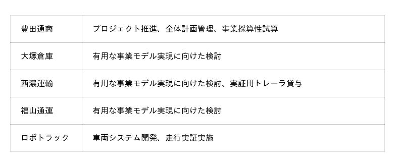 株式会社ロボトラック(以下:ロボトラック)は、当社及び豊田通商株式会社(以下:豊田通商)、大塚倉庫株式会社(以下:大塚倉庫)、西濃運輸株式会社(以下:西濃運輸)、福山通運株式会社(以下:福山通運)で構成される豊田通商コンソーシアムにて、国土交通省による「自動運転トラックによる幹線輸送の社会実装に向けた実証事業」に採択されたことを受けて、セミトレーラー型自動運転トラック(以下:自動運転セミトレーラー)の開発を行ってきました。